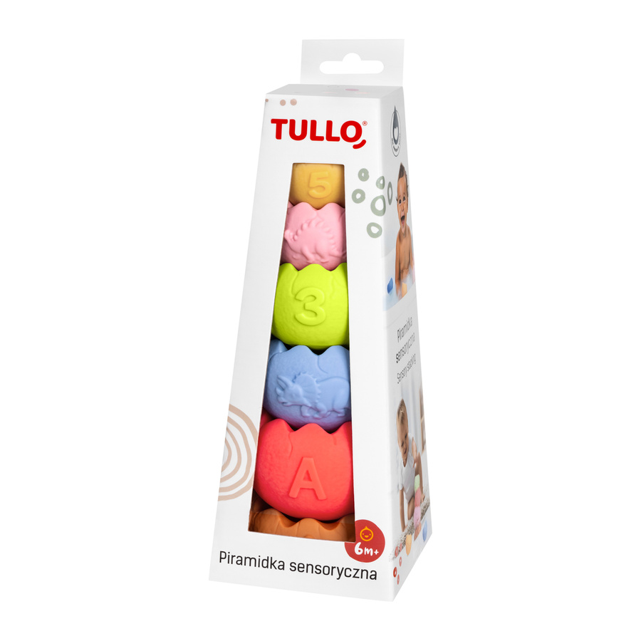 Edukacyjna piramidka Tullo® została zaprojektowana tak, aby stymulować zmysł dotyku poprzez różnorodne faktury i kształty. Maluchy mogą dotykać, układać i balansować elementy, co wpływa na rozwój ich percepcji sensorycznej.