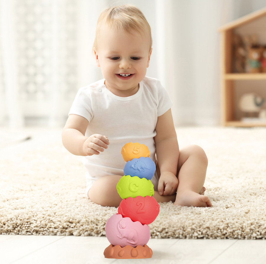 Zabawka nie tylko bawi, ale także uczy. Dzięki wypukłym literkom, cyferkom i dinozaurom, starsze dzieci mają okazję przyswajać podstawy alfabetu i matematyki. Zdolność do budowania piramidy wspiera również rozwój myślenia logicznego oraz koordynacji oko-ręka.