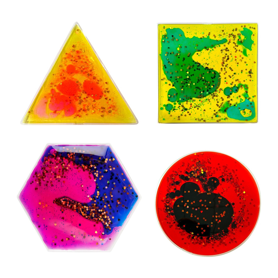 Zestaw antystresowych gniotków sensorycznych Tullo, który pobudza zmysły i relaksuje! W skład kompletu wchodzą cztery kształty geometryczne wypełnione kolorową cieczą i brokatem. Po ściśnięciu można obserwować, jak drobinki płynnie przemieszczają się w środku, tworząc hipnotyzujący i uspokajający efekt.