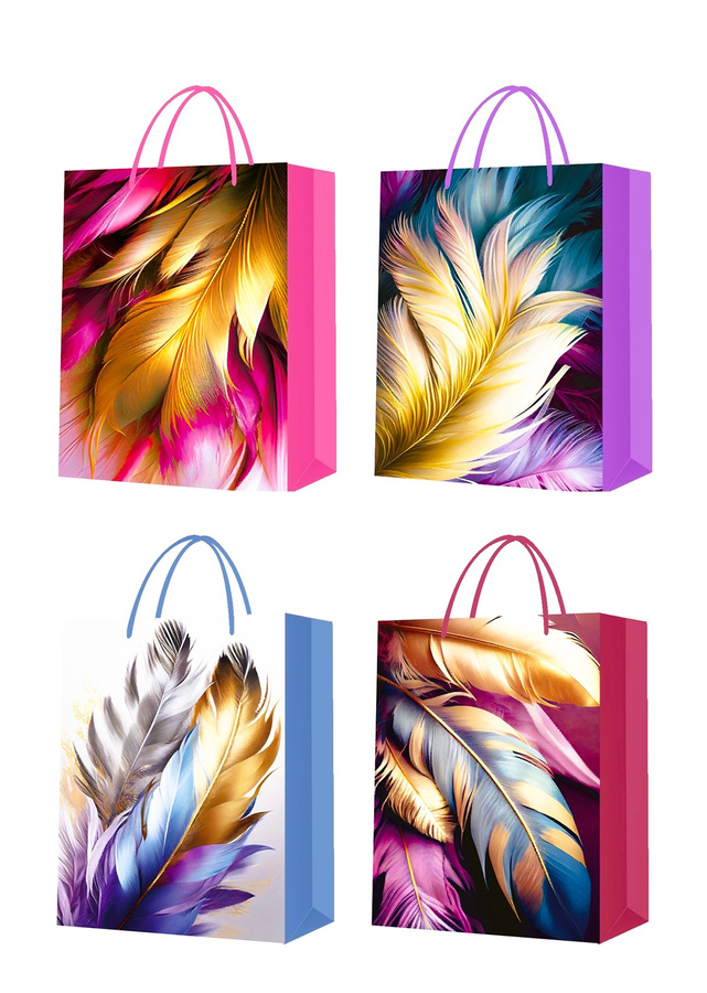 - Torebka prezentowa w żywych kolorach z motywem piórek.