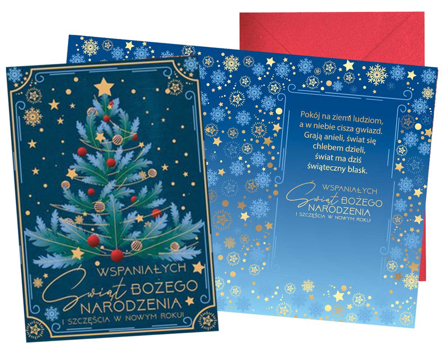 • Elegancki karnet świąteczny z motywem choinki na niebieskim tle. Złocone detale i świąteczne życzenia w środku sprawiają, że to idealna kartka do przekazania ciepłych słów z okazji Bożego Narodzenia. W zestawie dopasowana koperta.