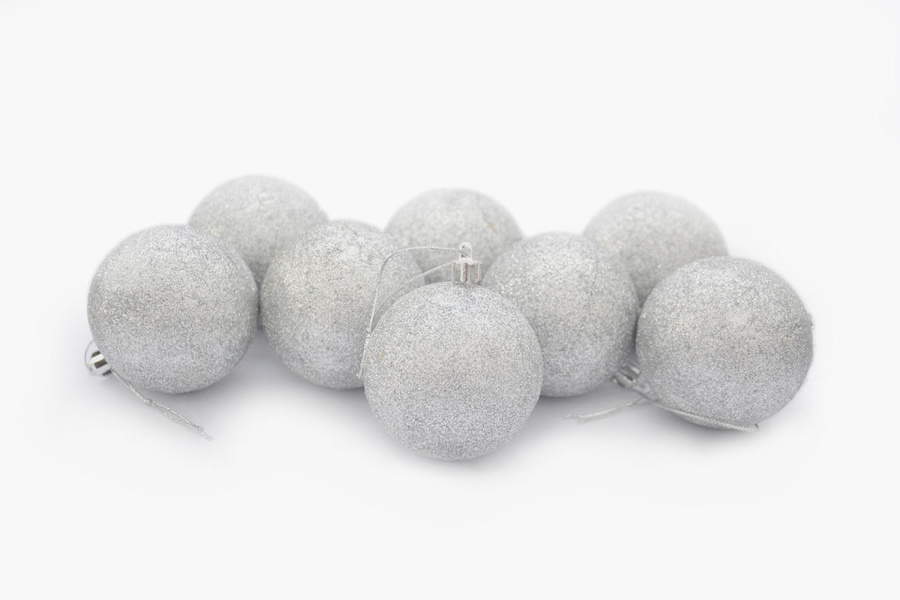 • Zestaw bombek choinkowych w kolorze srebrnym, pokrytych mieniącym się brokatem.