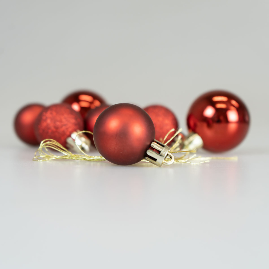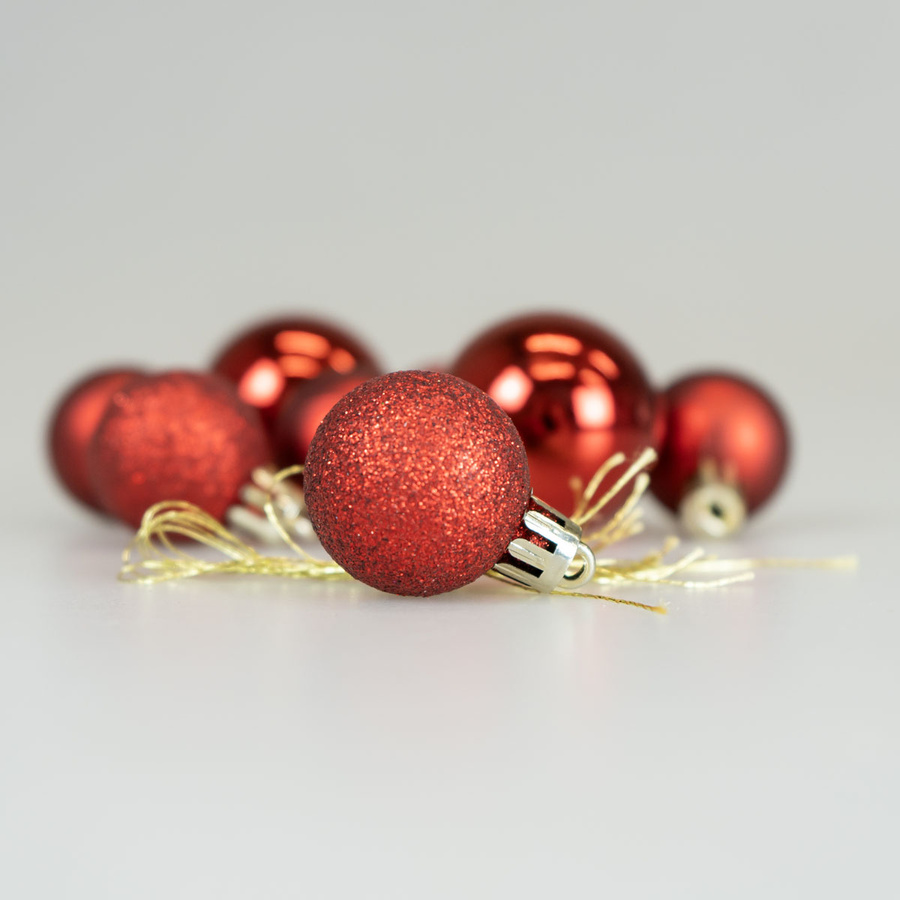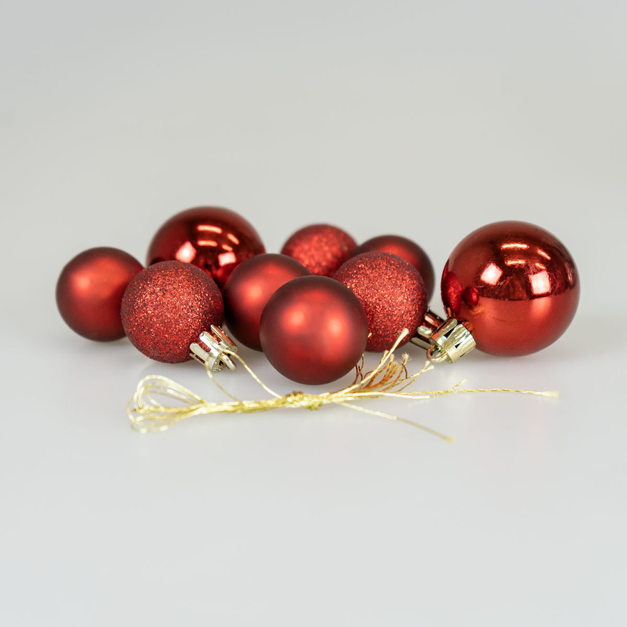 • Zestaw bombek choinkowych w kolorze czerwonym, zapakowanych w ozdobną kulę.