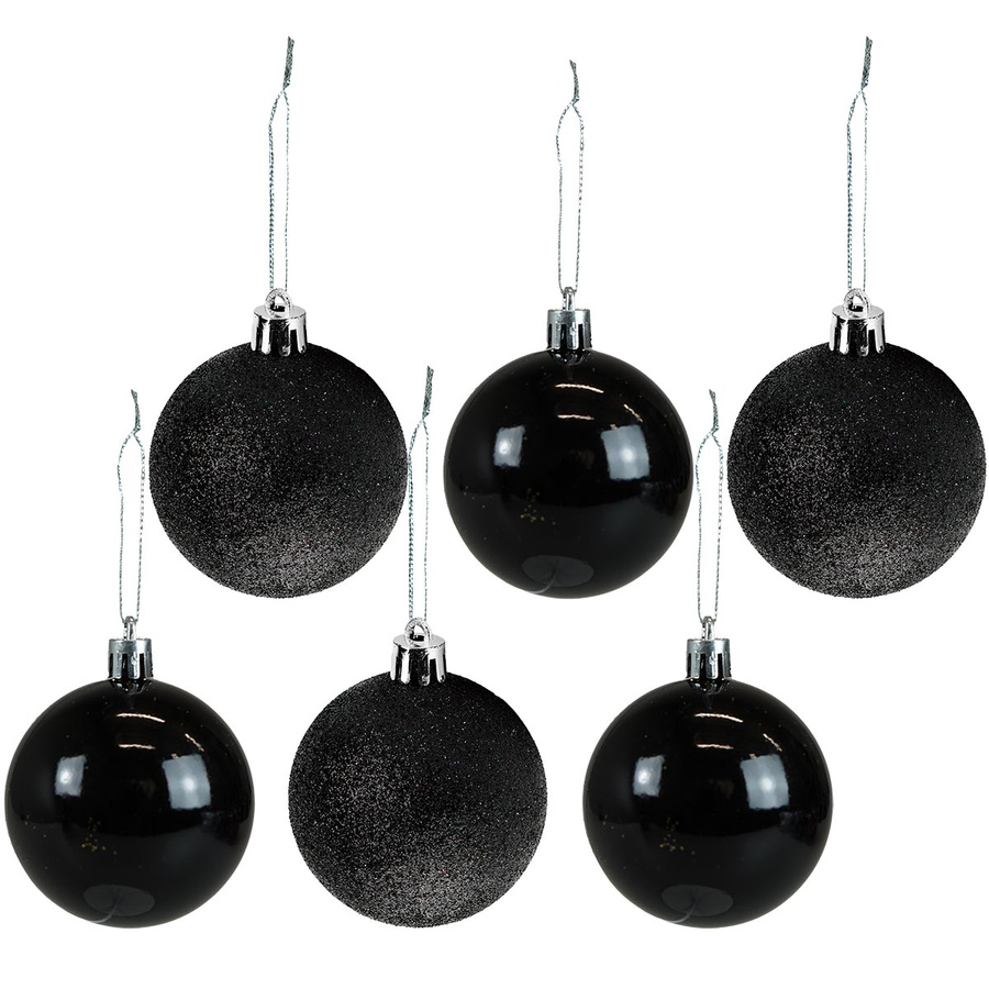 • Zestaw bombek choinkowych w kolorze czarnym, w dwóch różnych wykończeniach: błyszczącym oraz brokatowym..