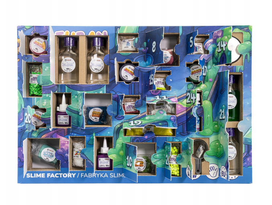 Odkryj magiczny świat mas plastycznych, piasków, slime’ów i eksperymentów w naszym sensorycznym kalendarzu adwentowym. Każde z 24 okienek to wyjątkowa niespodzianka – gotowa masa do zabawy lub składniki i dodatki do stworzenia własnych slimów. Idealny zestaw dla dzieci, które kochają eksperymenty i sensoryczne doznania! Kalendarz adwentowy od Tuban to zabawa, która rozwija: wspiera rozwój motoryki małej, kreatywność, koncentrację i zmysł dotyku. Idealny jako prezent mikołajkowy lub grudniowa niespodzianka, która każdego dnia przynosi nową radość.