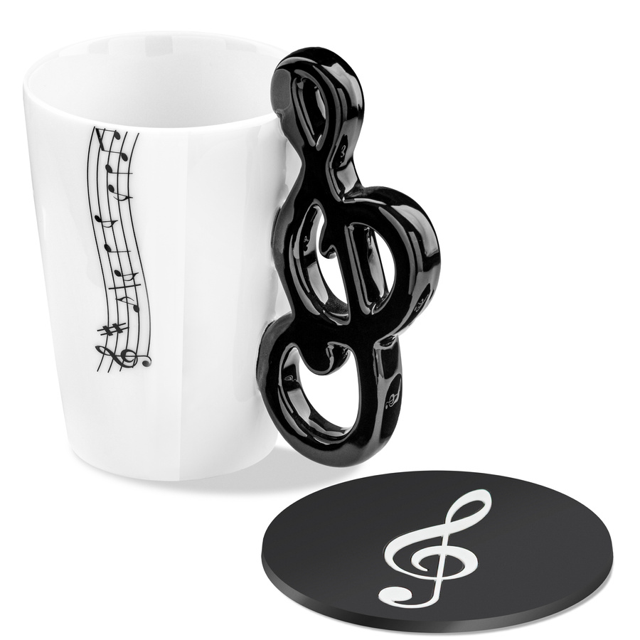 • Elegancki zestaw Music Gift Duo – kubek z kluczem wiolinowym i podkładka z tym samym motywem. Idealny prezent dla miłośników muzyki, stylu i harmonii.