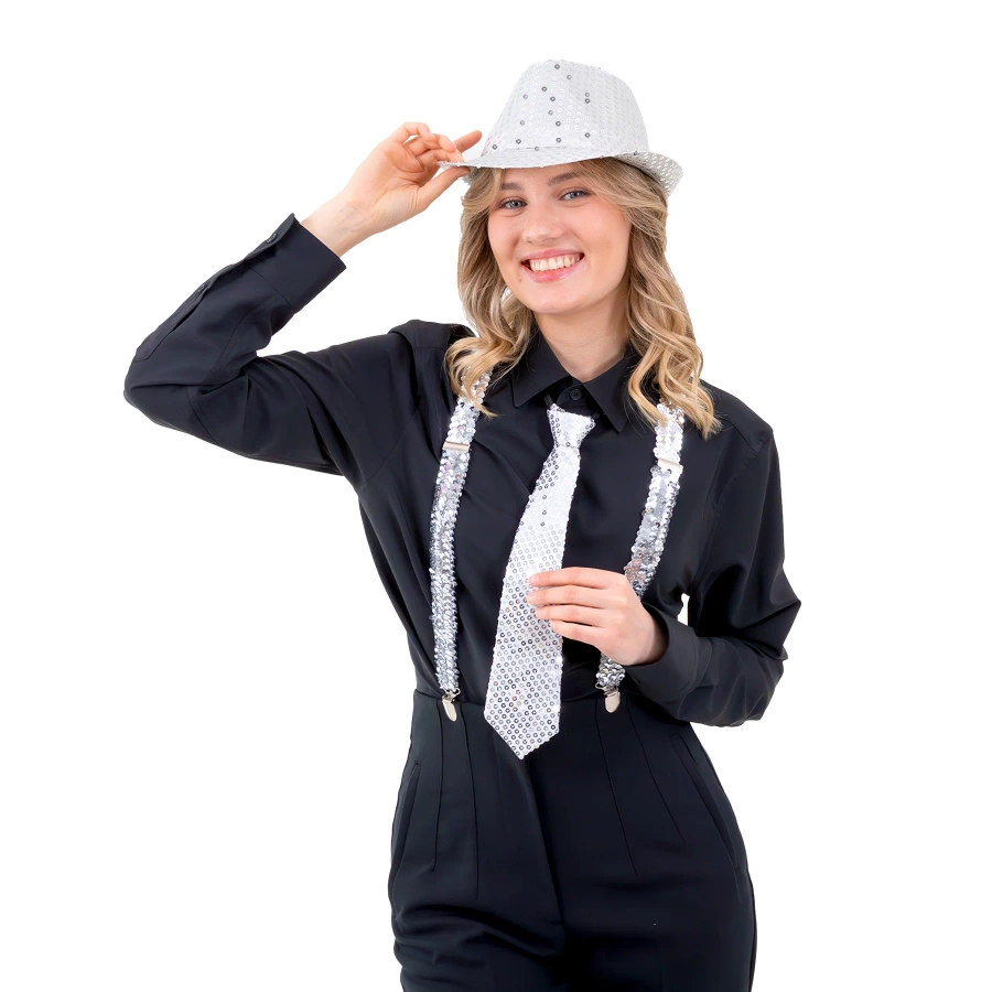 Stylowy krawat cekinowy to efektowny dodatek, który przyciąga wzrok i dodaje charakteru każdej imprezowej stylizacji. Wykonany z materiału pokrytego błyszczącymi cekinami, pięknie odbija światło i świetnie prezentuje się zarówno w klubowym oświetleniu, jak i na scenie.