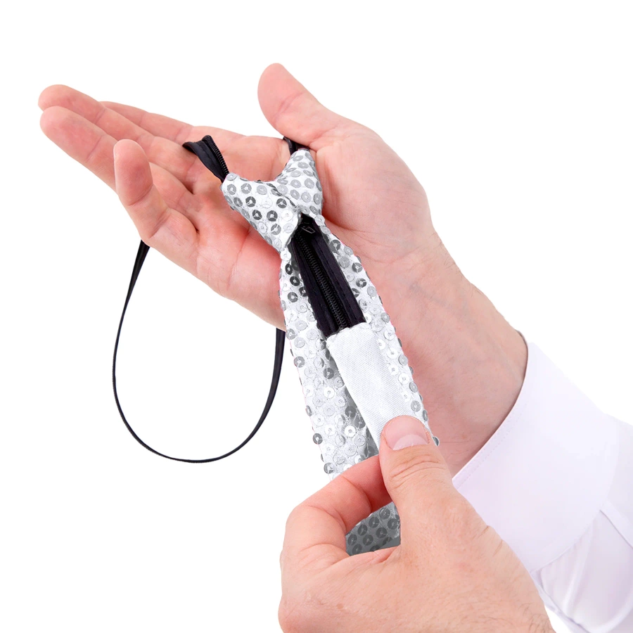 - Elegancki czarny krawat cekinowy o długości 36 cm, zapinany na wygodny zamek błyskawiczny. Idealny dodatek do imprez, występów scenicznych i stylizacji tematycznych.