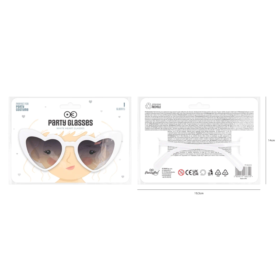 - Imprezowe okulary Serduszka w kolorze białym. Szerokość: 15 cm. Wysokość: 6 cm. Długość zausznika: 14 cm. Cena za sztukę.