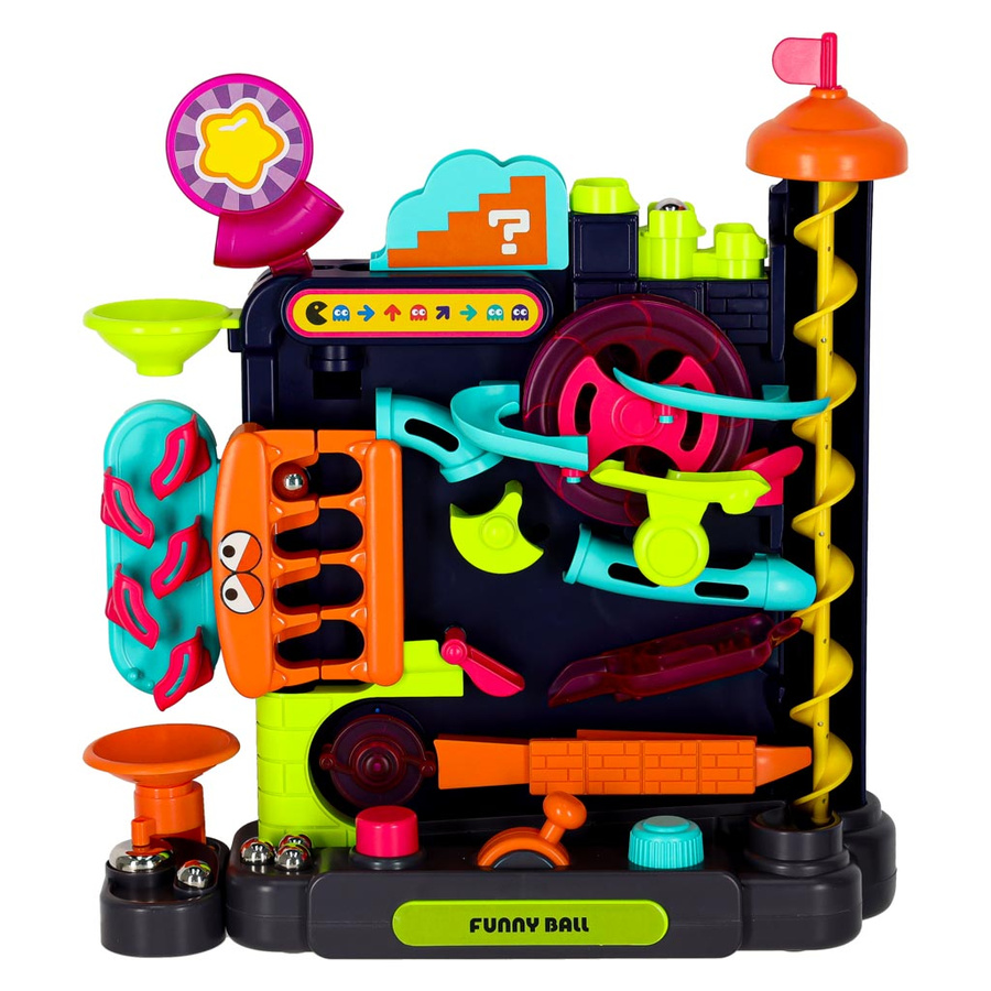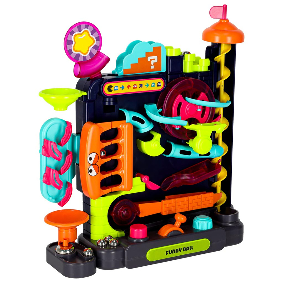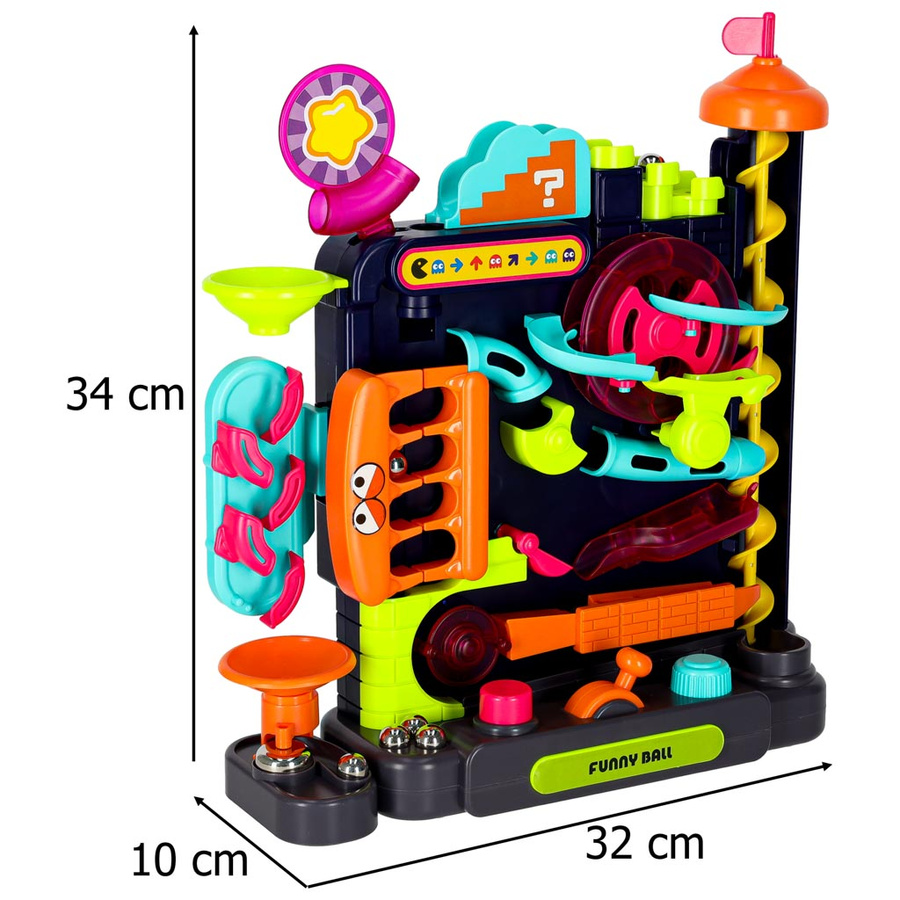 - Kulkowy tor przeszkód STEM rozwijający logiczne myślenie, zręczność i motorykę. Poruszaj elementami na planszy za pomocą dźwigni i pokręteł, by kulki potoczyły się do celu. Wymiary zabawki: 32 cm x 34 cm x 10 cm