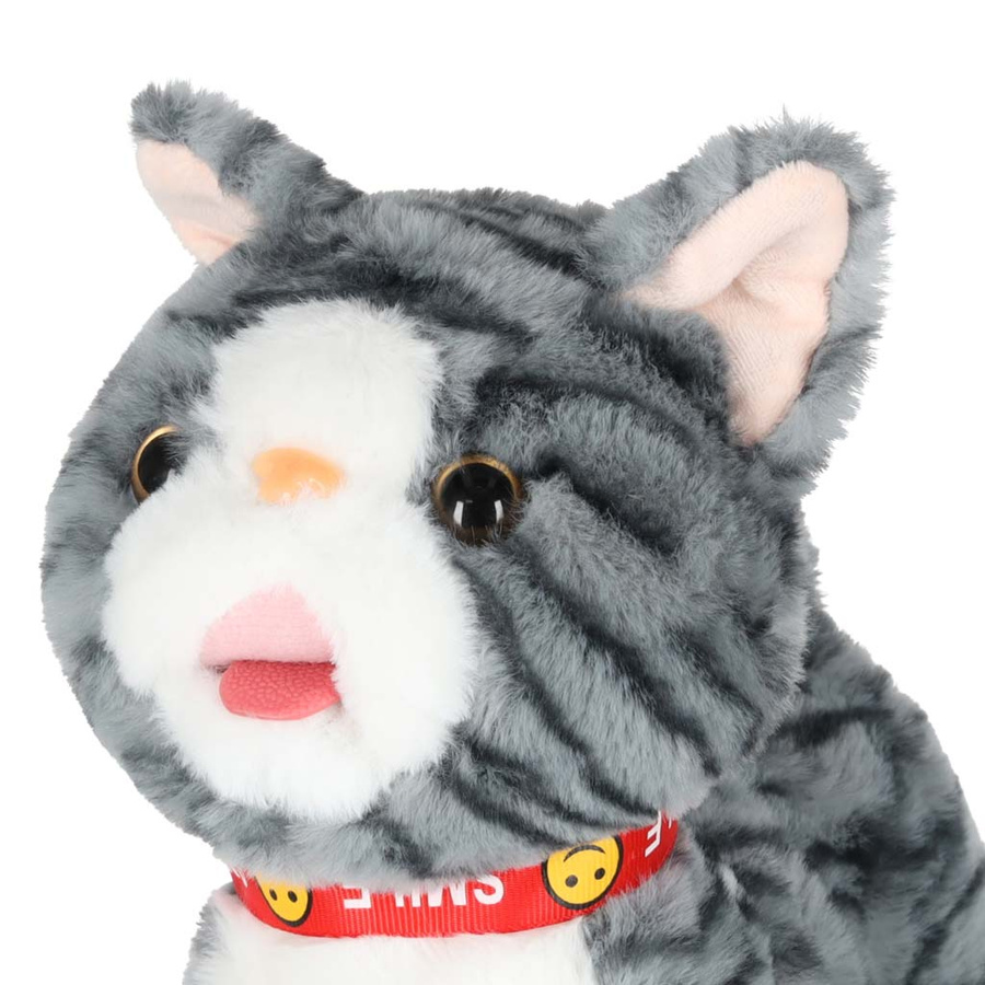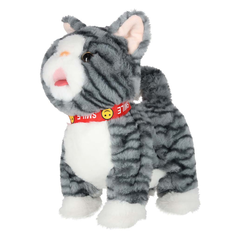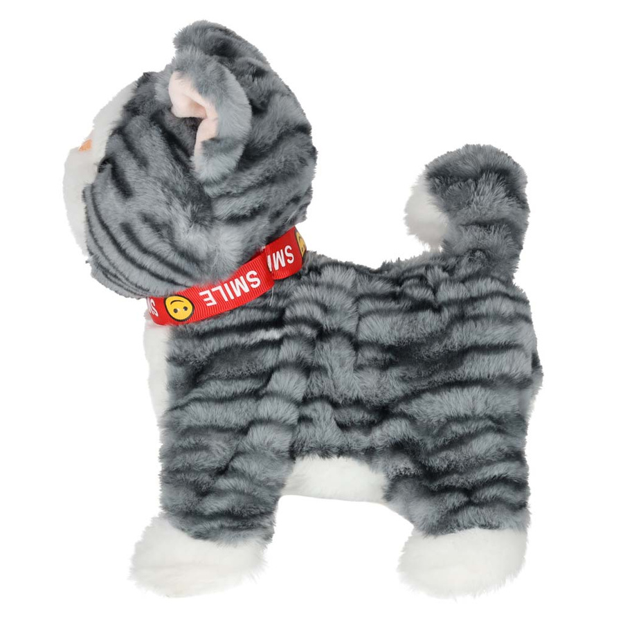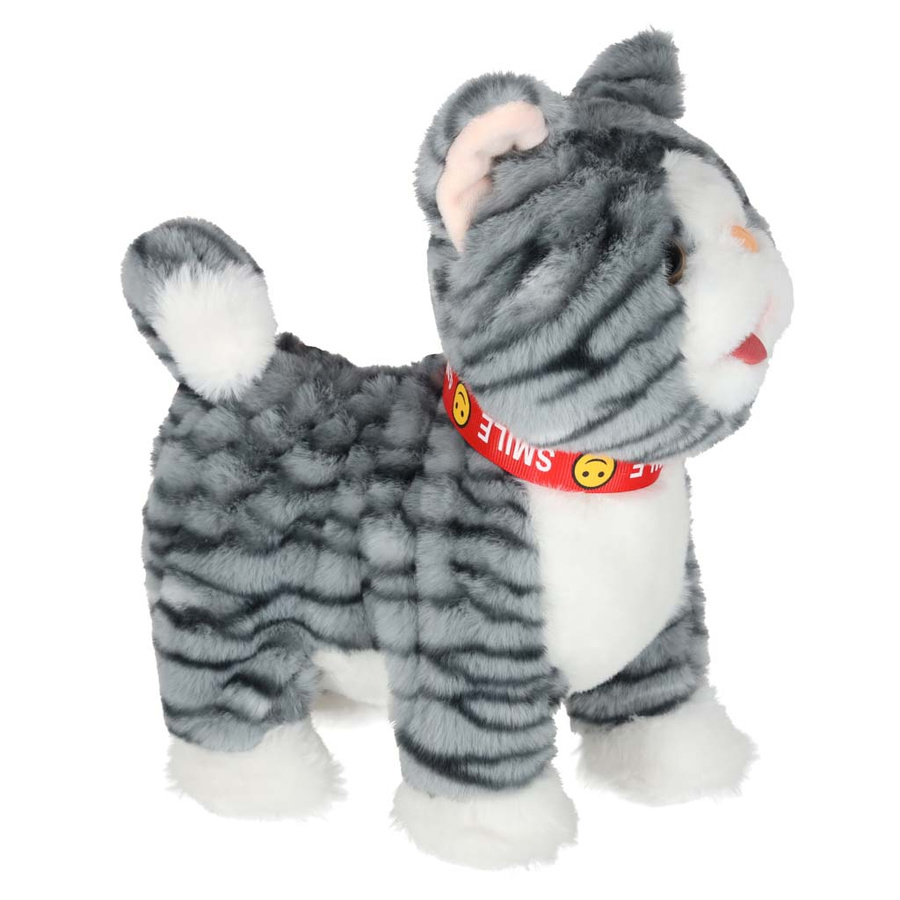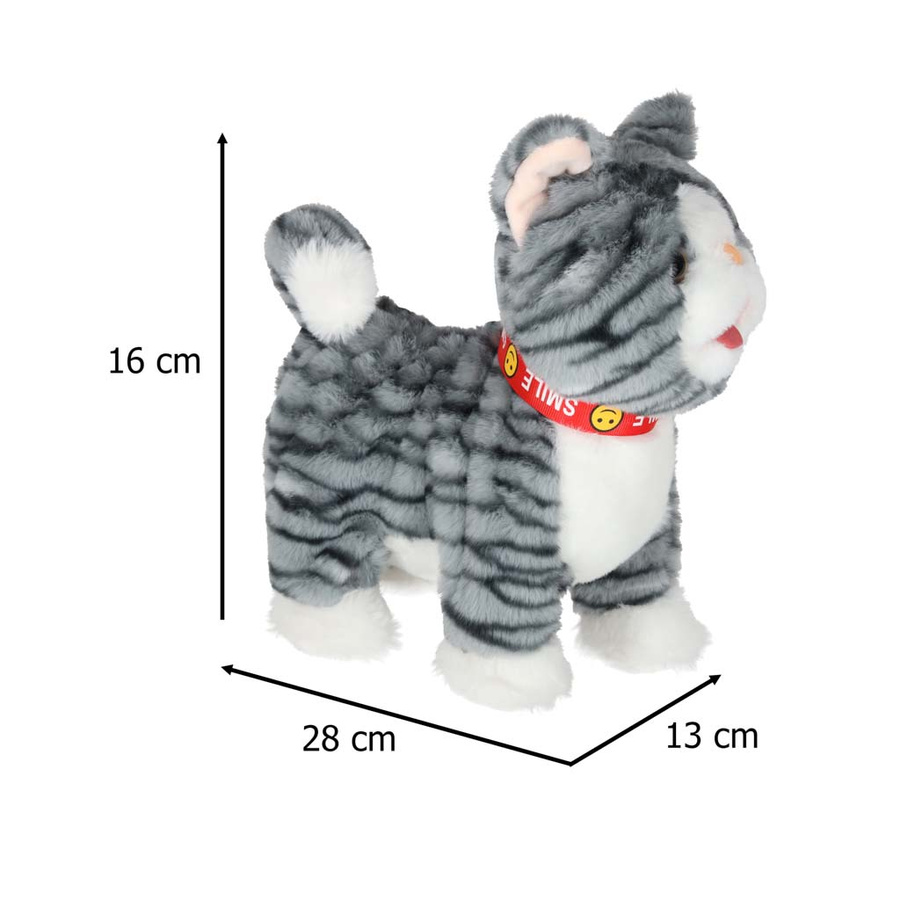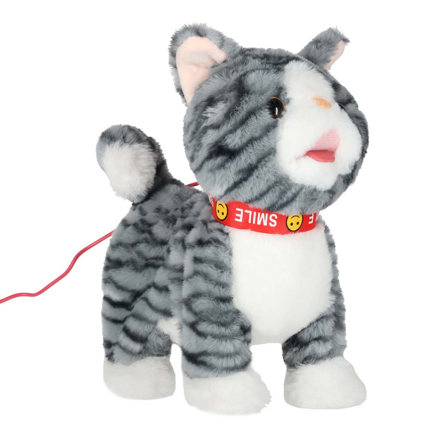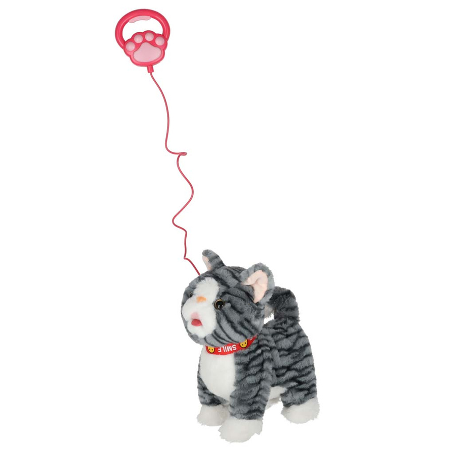 - Szary kotek na smyczy STEM, który jednocześnie chodzi i odtwarza piosenki w języku angielskim. Po pogłaskaniu kotek miauczy, macha ogonkiem i porusza językiem. Pluszowa zabawka na baterie AA da dzieci od 3 lat. Wymiary: 16 x 13 x 28 cm