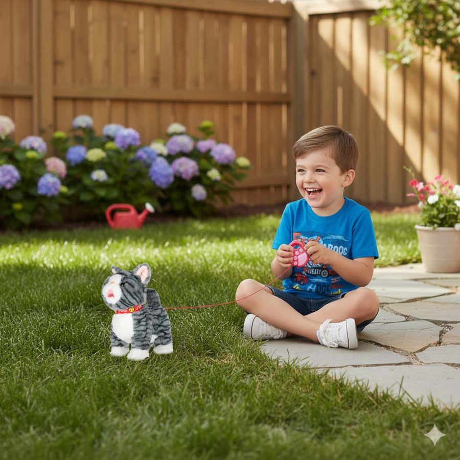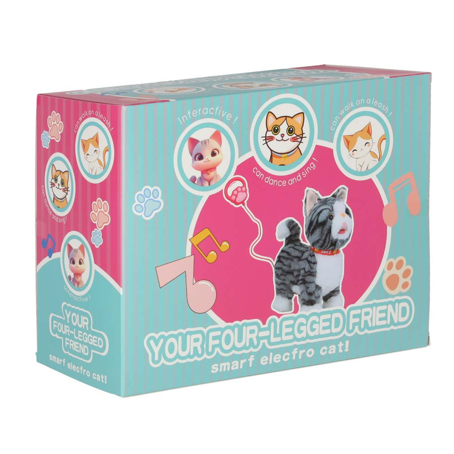 Kotek idzie do przodu, grając piosenki – po wciśnięciu przycisku na smyczy, kotek zaczyna iść do przodu, jednocześnie odtwarzając wesołe melodyjki