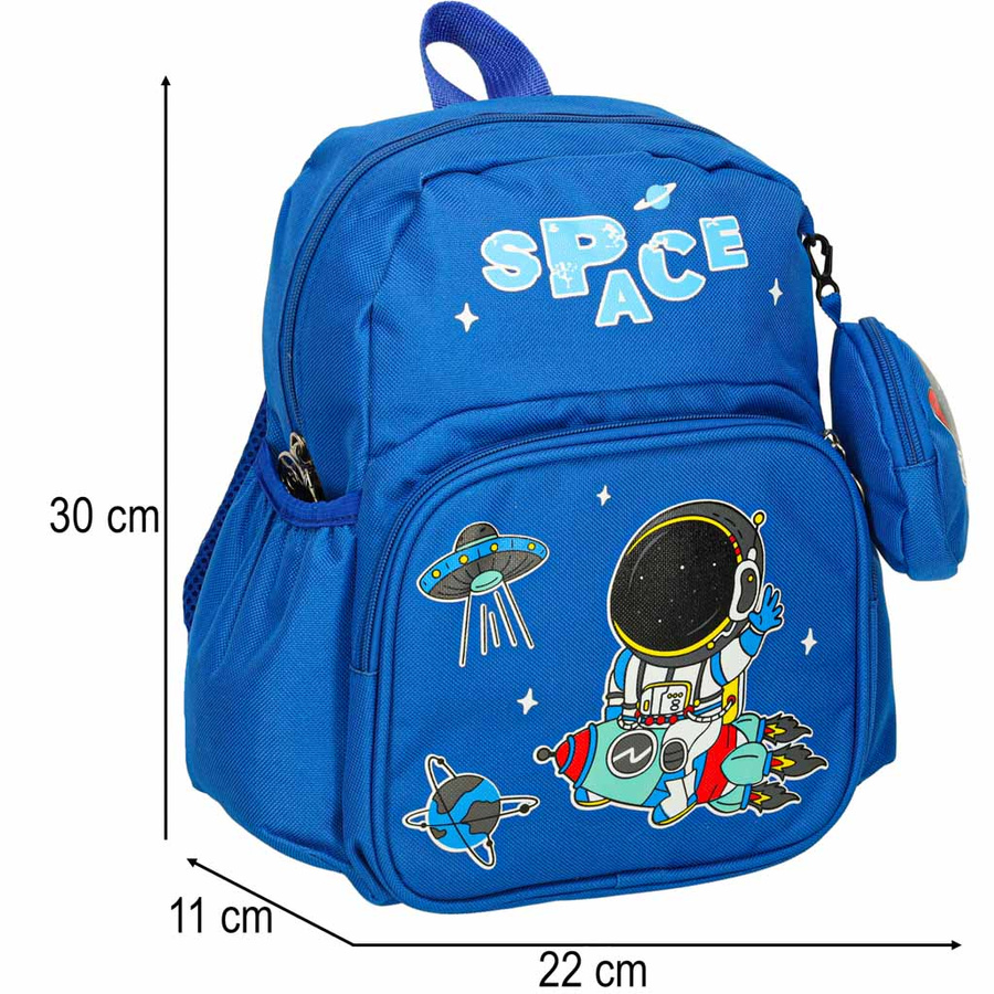 - Plecak dziecięcy z grafiką astronauty, wykonany z lekkiego i wytrzymałego nylonu. Wyposażony w dużą komorę główną, przednią kieszeń na suwak, odczepianą okrągłą saszetkę oraz dwie boczne kieszonki. Regulowane szelki, pojemność ok. 7,5 L