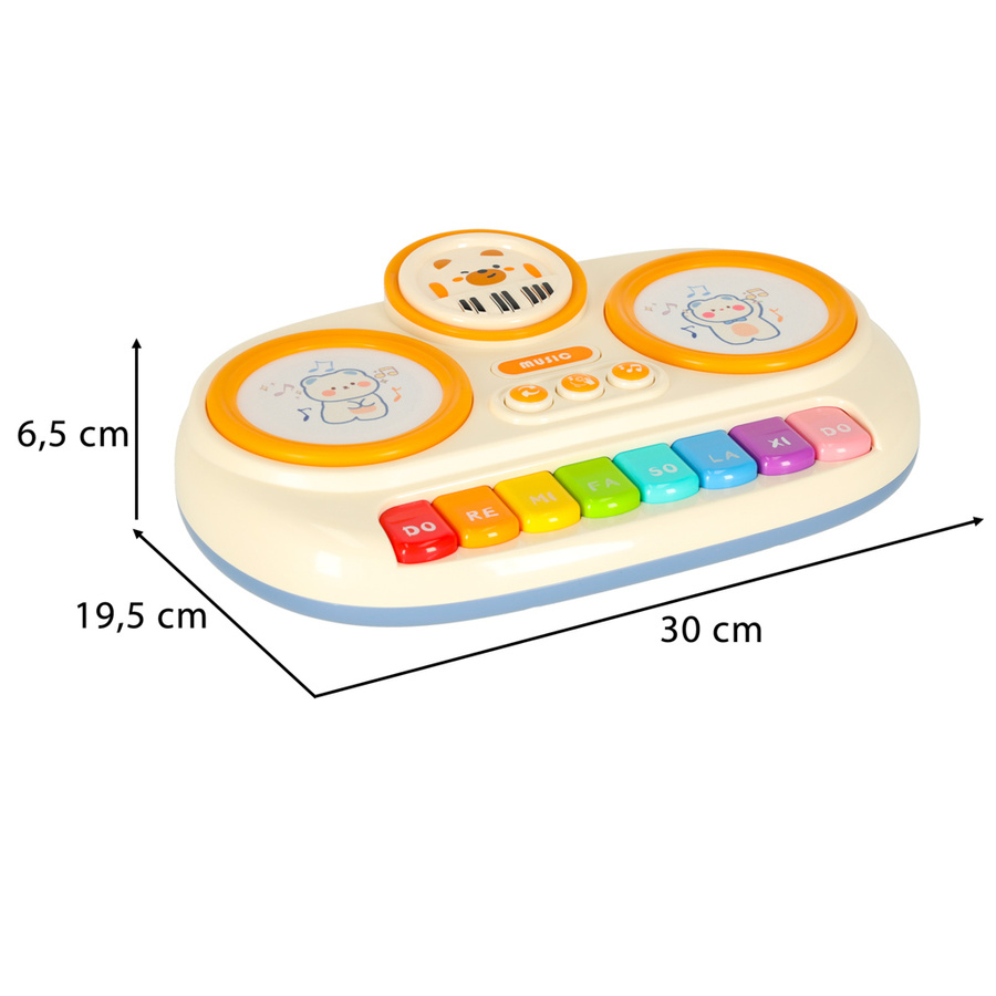 - Kolor: beżowy, pomarańczowy, kolorowy. Materiał: wysokiej jakości tworzywo sztuczne. Wymiary: 30 x 19,5 x 6,5 cm. Efekty: dźwiękowe i świetlne. Zasilanie: 3x baterie AA (brak w zestawie). Wiek: 12m +. Opakowanie: oryginalne, kolorowe pudełko producenta. P