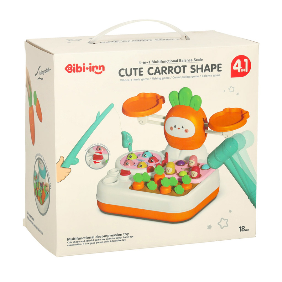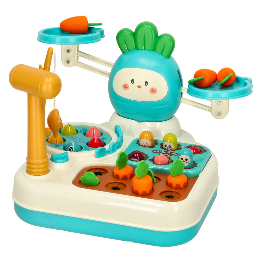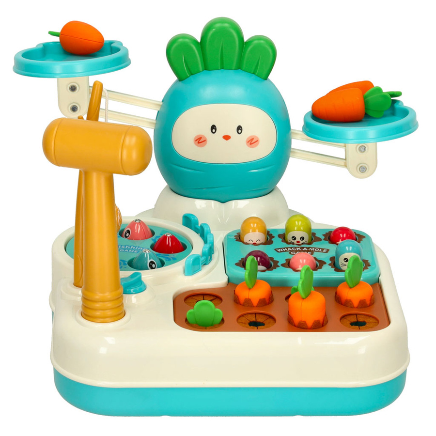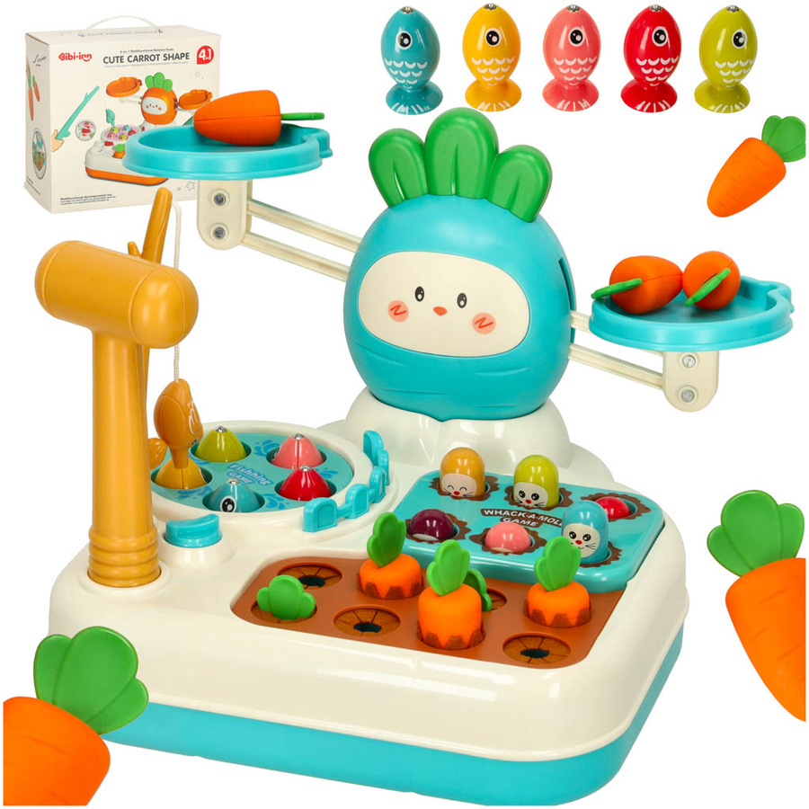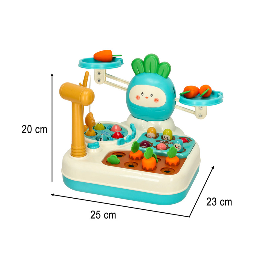 Ten kolorowy zestaw łączy w sobie aż cztery fascynujące gry, które rozwijają wyobraźnię i zdolności manualne dziecka. Dzięki młotkowi, wędce i pozostałym akcesoriom, Twoje dziecko będzie mogło grać w łowienie rybek, uderzanie w kreta, zbieranie marchewek oraz balansowanie wagą.
