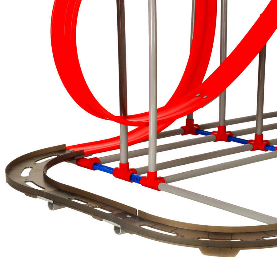Zestaw zawiera 175 elementów, które pozwalają zbudować imponującą trasę o wymiarach 130 x 56 x 94,5 cm, na której auto może jeździć, pokonując ostre zakręty, strome podjazdy, a nawet odwrócone odcinki trasy.