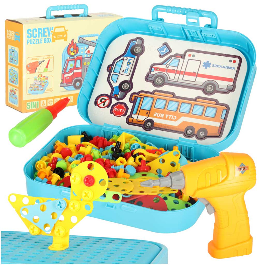 Klocki konstrukcyjne układanka w walizce kreatywna mozaika + wkrętarka pojazdy