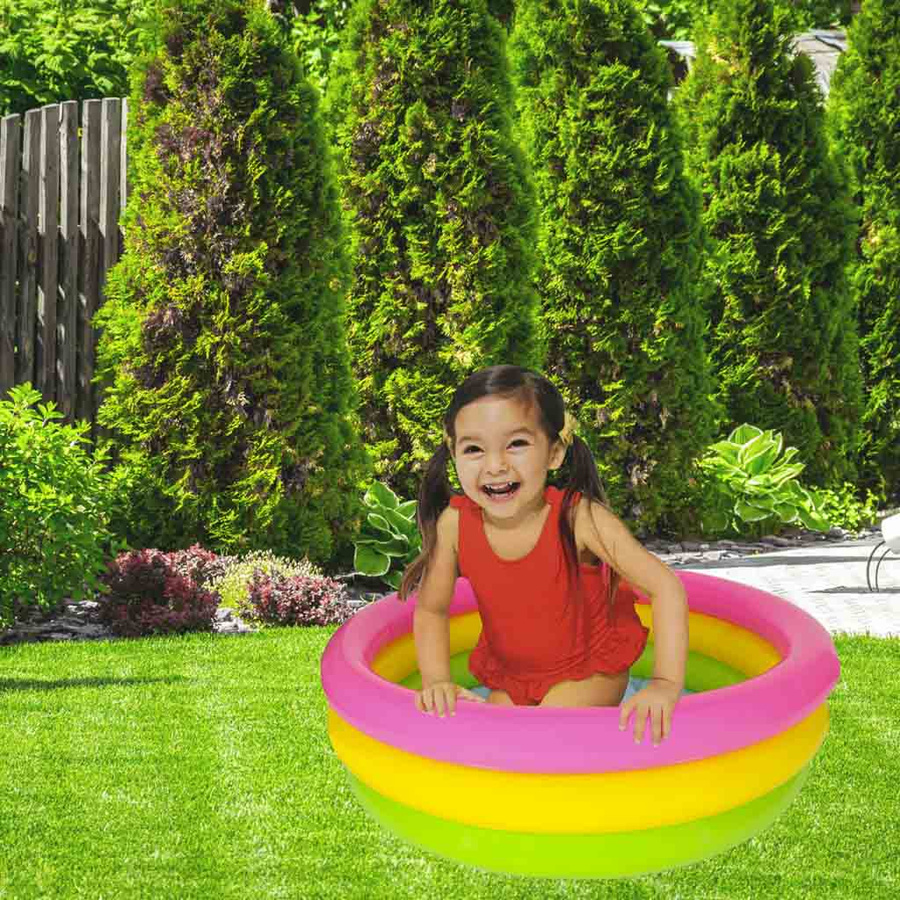 Basen składa się z trzech oddzielnie dmuchanych okręgów w jaskrawych barwach, które przyciągną uwagę malucha. Posiada również miękkie, dmuchane dno, które izoluje od zimnego podłoża i zapewnia komfort.