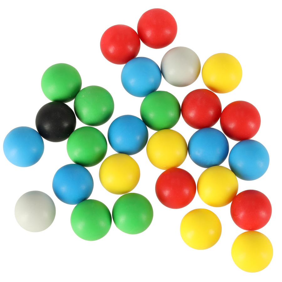 przestrzenna plansza, podstawkę do kul, 6 czerwonych kul, 6 zielonych kul, 6 żółtych kul, 6 niebieskich kul, 2 szare kule, czarną kulę, 16 kart kodów oraz instrukcję.
