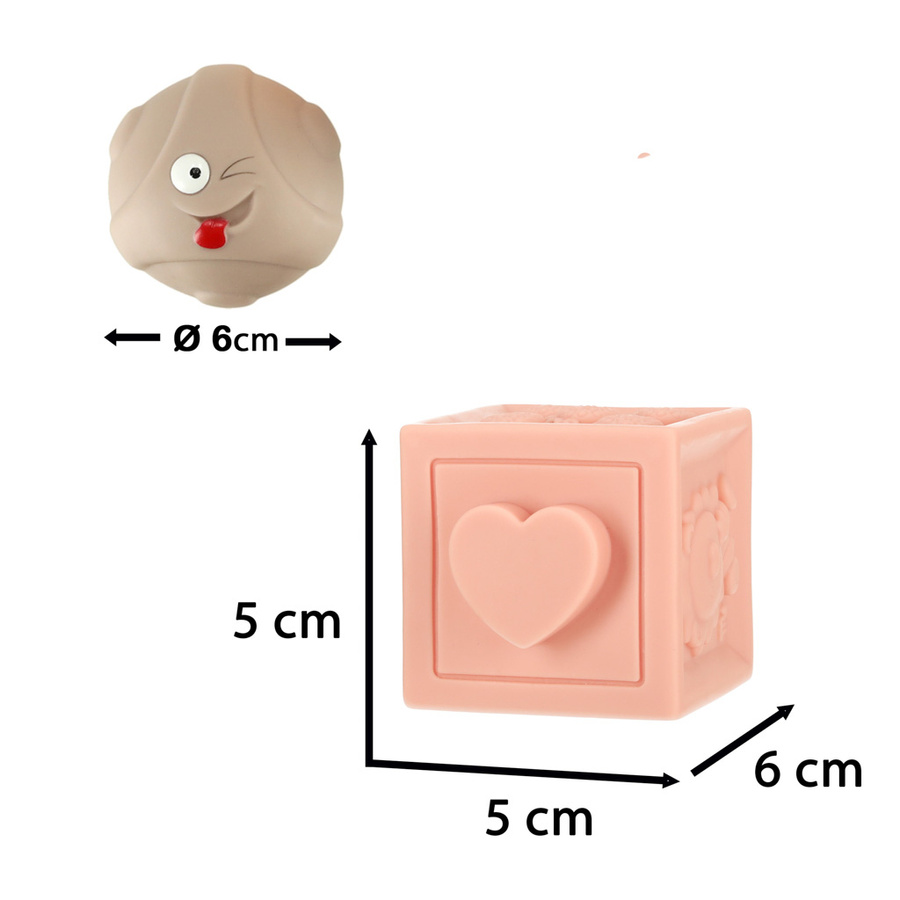 - Piłeczki i klocki sensoryczne wykonane z miękkiego silikonu. Zestaw zapewni wszechstronną zabawę pełną rozrywki, nauki i rozwoju. Na klockach znajdują się różne wzory oraz liczby. Wiek: 6m+. Klocek: 5 cm x 5 cm x 6 cm. Kulka: 6 cm.