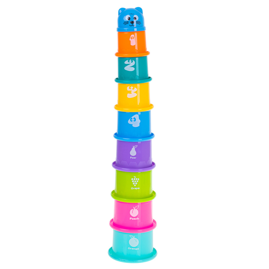 - Kolorowe kubeczki edukacyjne pomagające w nauce cyfr i kolorów oraz poprawiające zdolności manualne dzieci. Każdy z kubków ma inny rozmiar i można je układać jeden na drugim tworząc wieżę. Tworzywo: plastik. Ilość kubków: 9. Wym. wieży: 8 x 38,2 cm.