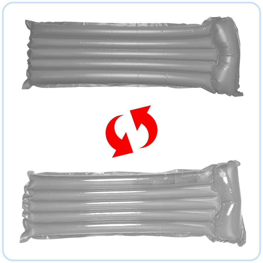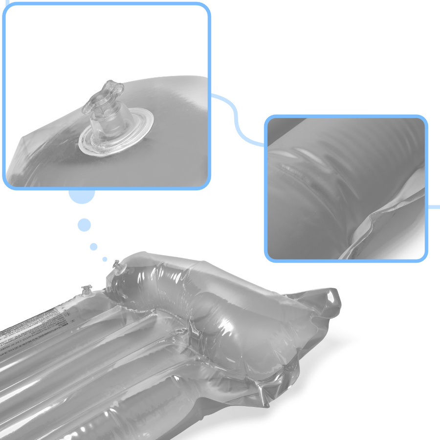 - Klasyczny dmuchany materac do wody - posiada dwie komory powietrze oraz wyprofilowaną poduszkę, aby dryfowanie na wodzie było czystą przyjemnością. Kolor: szary. Wymiary: 183 cm x 76 cm.