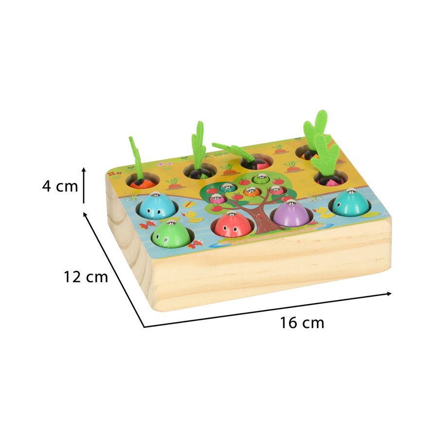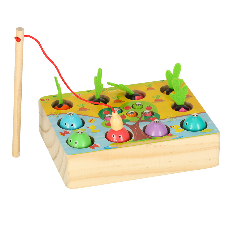 - Świetna gra magnetyczna łowienie rybek. Skradnie serce każdego dziecka. Gra polega na łowieniu magnetycznych elementów. Zabawa rozwija koordynację dziecka. W zestawie: 5 marchewek, 5 robaczków, 5 rybek, wędka. Dł. wędki: 15cm. Wym. podstawy: 16x12x4cm.