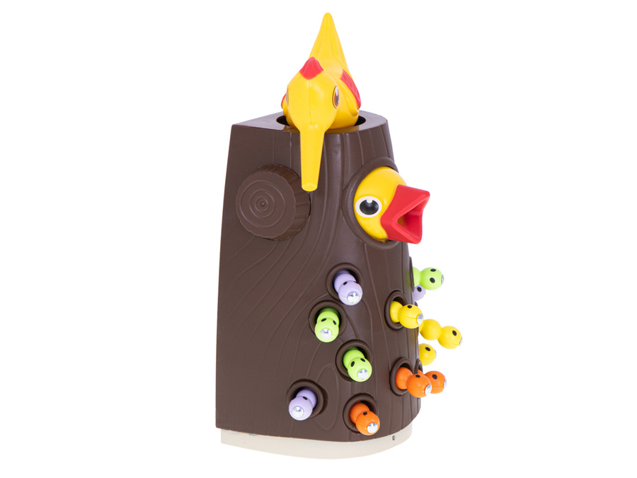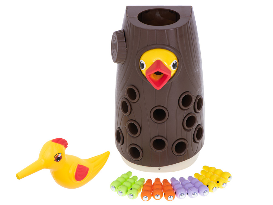 - Świetna gra magnetyczna. Polega na łowieniu robaczków i karmieniu ptaszka. Zabawa pozytywnie wpłynie na koordynację wzrokowo-ruchową dziecka. W zestawie: 12 robaczków, drzewko, dzięcioł. Tworzywo: plastik. Dł. robaczka: 4,5cm. Wym. drzewka: 10x8,5x18,5cm.