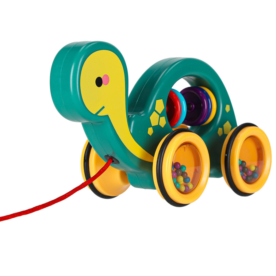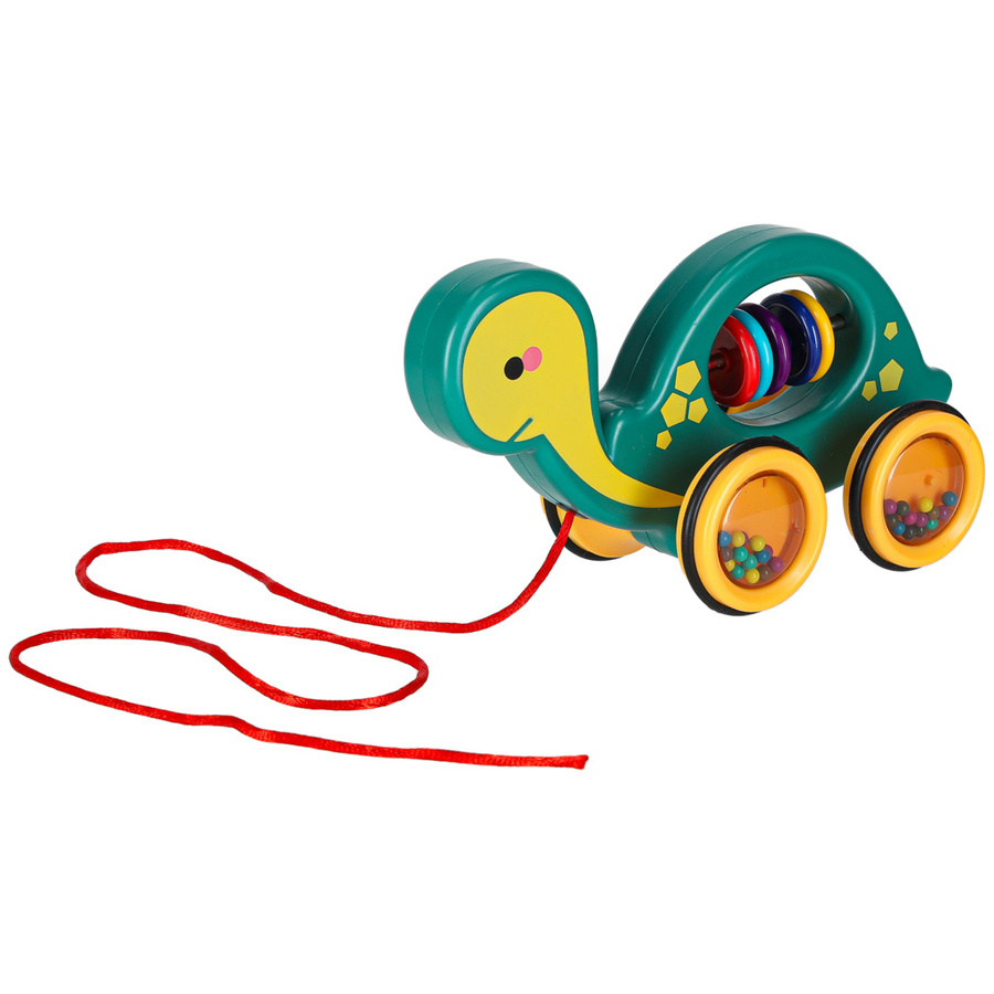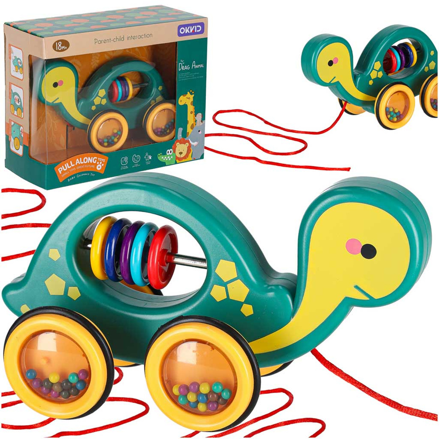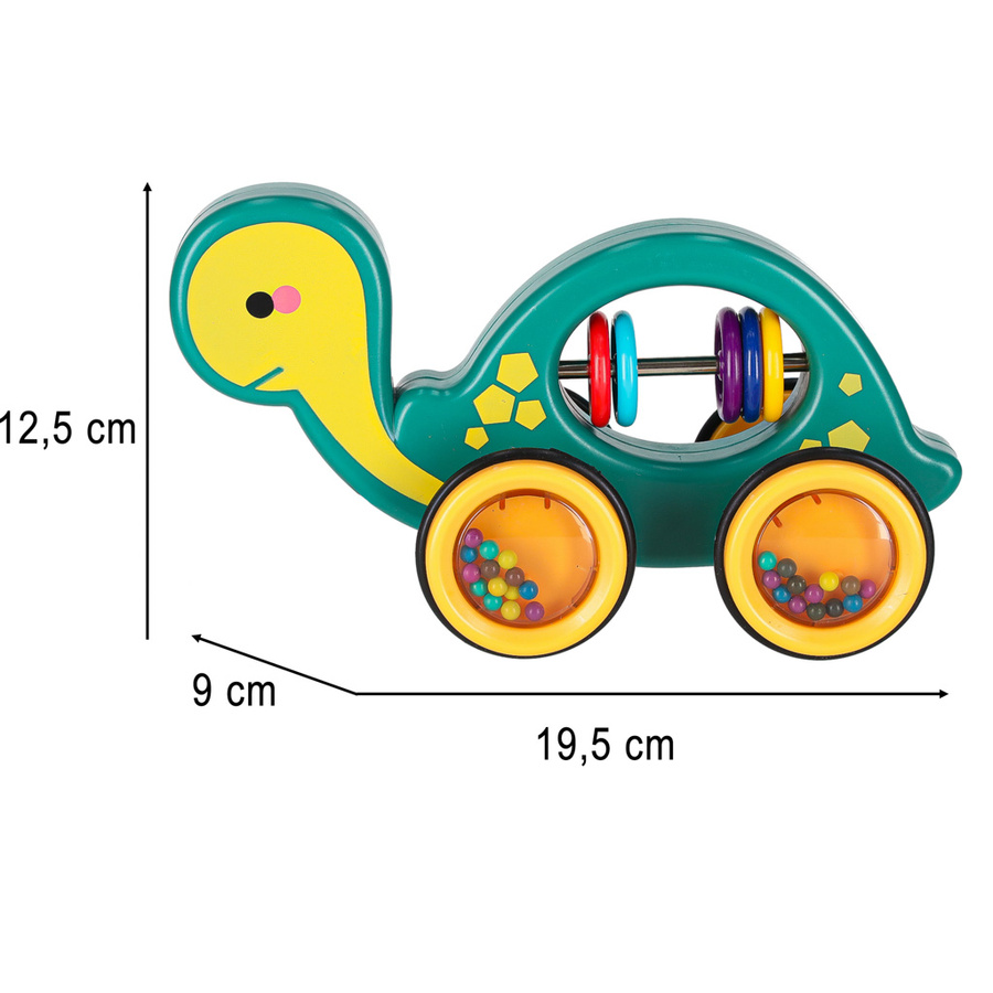 - Zabawka w kształcie żółwika. W kółkach umieszczone są kuleczki, które grzechoczą podczas jazdy. Wewnątrz pięć kolorowych kółek można samodzielnie przesuwać. Długi sznurek pozwoli zabrać zabawkę np. na spacer. Wymiary żółwia: 19,5x9x12,5cm.