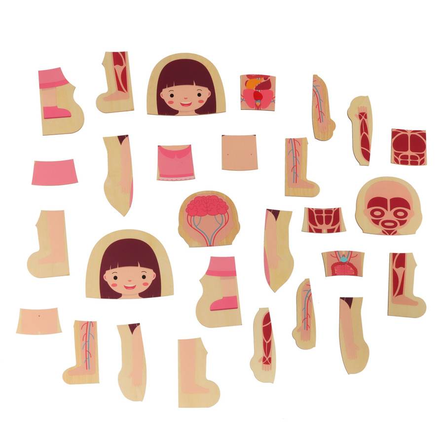 Puzzle drewniane warstwowe budowa ciała montessori dziewczynka