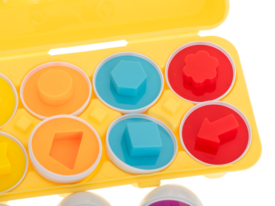 - Rewelacyjna układanka sensoryczna. Skradnie serce każdego małego odkrywcy. Zabawa polega na dopasowaniu odpowiednich kształtów i kolorów figur geometrycznych, aby powstało całe jajko. W zestawie: 12 jajek. Wym. 1 jajka (obwód x wysokość): 15x7,5cm.