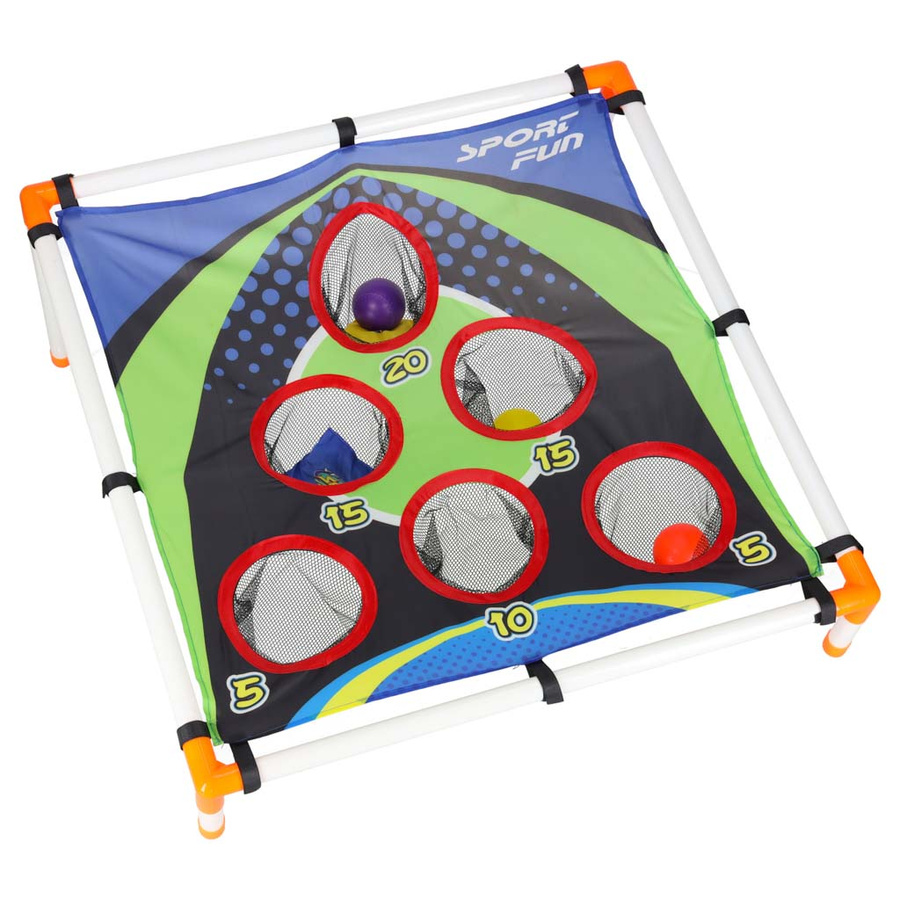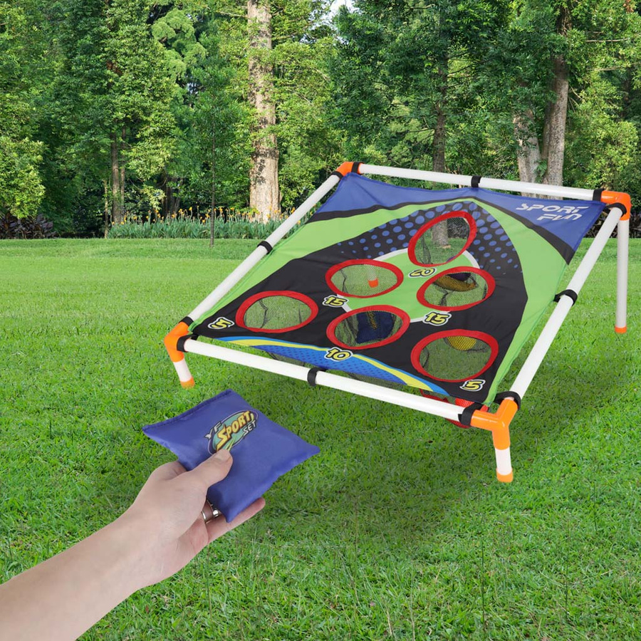 - Świetna gra rzut do celu woreczkami. Polega na celowaniu przez dziecko do otworów w planszy i rzucanie do nich woreczkami. Wpływa na rozwój siły i szybkości. W zestawie: 3woreczki, 3piłki, stelaż na tarczę, tarcza z otworami. Wym. zabawki: 71x71x36,5cm.