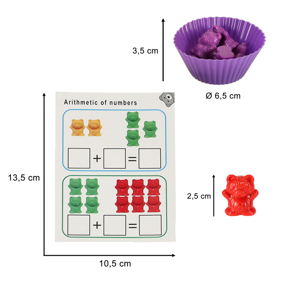 - Edukacyjne misie służące do nauki matematyki przez zabawę. Zestaw pobudzi kreatywność i logiczne myślenie. W zestawie: 36 misiów, 6 silikonowych kubeczków, 2 drewniane kostki i 16 kart z zadaniami. Tworzywo: plastik. Wymiary opakowania:16,5x12x5,5cm.