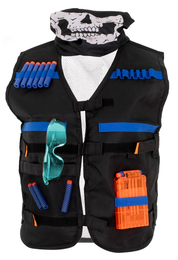 - Kamizelka wykonana z wytrzymałego materiału. Posiada paski z rzepami oraz dodatkowe miejsca do przechowywania potrzebnych akcesoriów. W zestawie: kamizelka, bandanka, okulary, 20 strzałek Nerf, magazynek i opaska na rękę. Wymiary: 52x46cm.