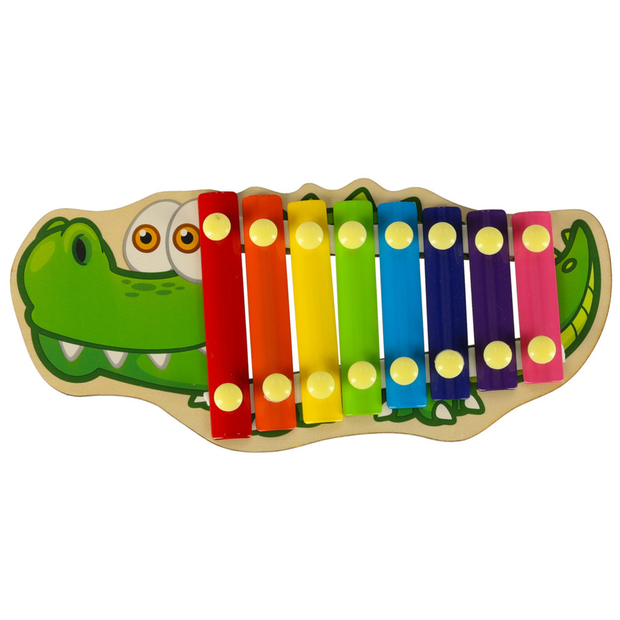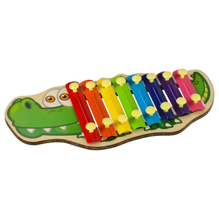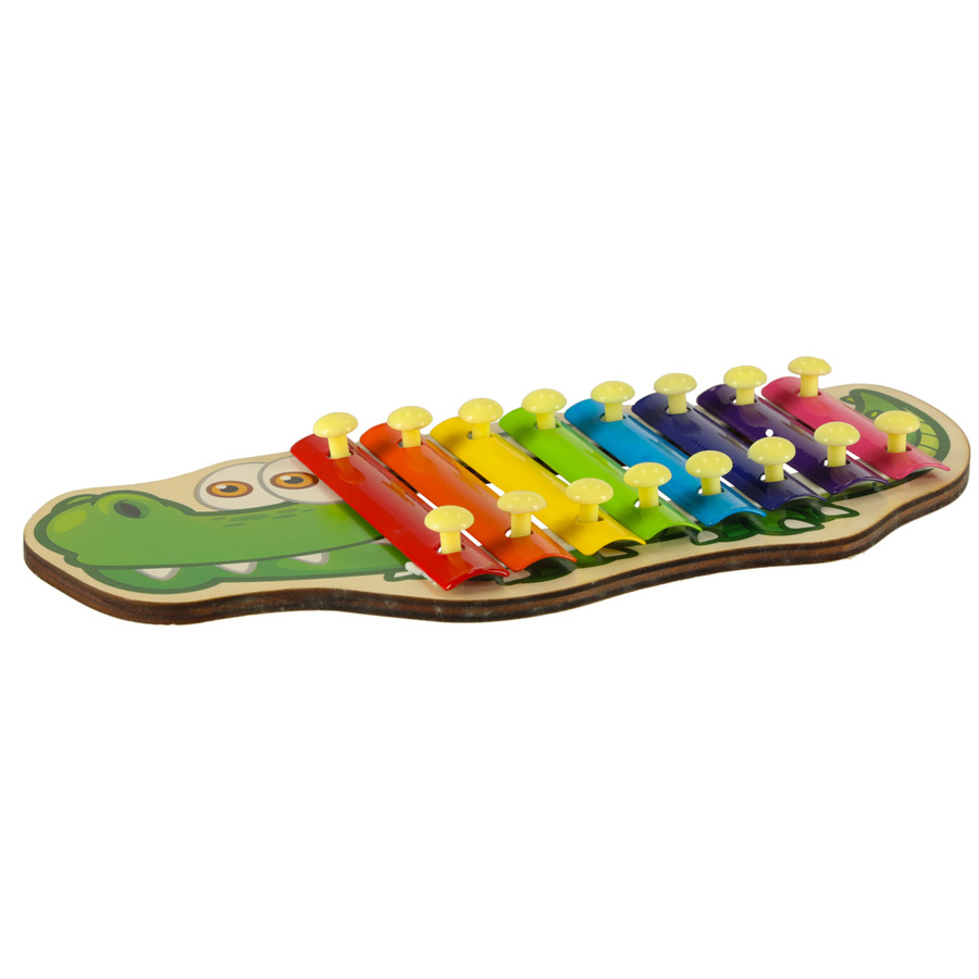 - Kolorowe drewniane cymbałki w kształcie krokodyla z 8 metalowymi szczebelkami w tęczowych kolorach. Zestaw zawiera 2 pałeczki. Wymiary opakowania: 25x12x2cm. Długość cymbałek: ~17cm.