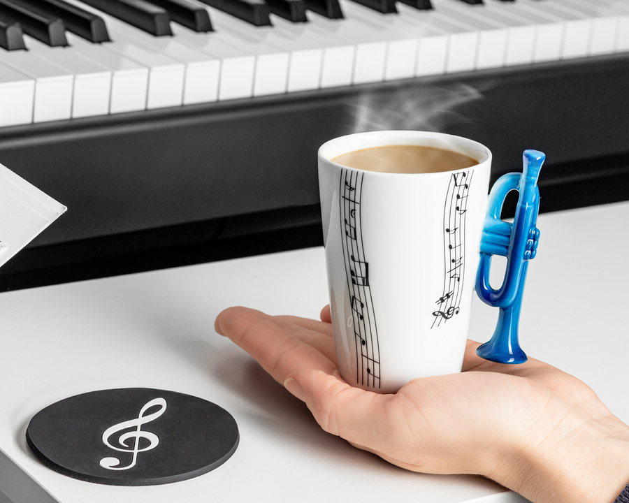 - Elegancki zestaw Music Gift Duo – kubek z trąbką i podkładka z kluczem wiolinowym. Idealny prezent dla miłośników muzyki, stylu i harmonii.