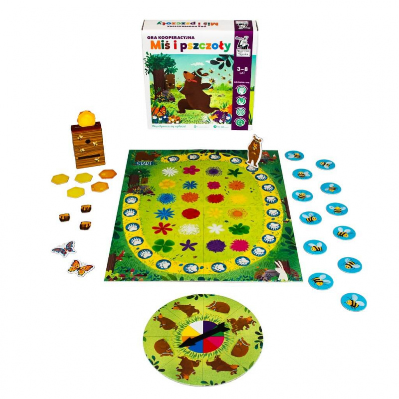 Gra Miś i pszczoły zachwyci przedszkolaka, miłośnika pszczół i graczy, którzy lubią drużynowe rozgrywki. Dzięki 3 wariantom, grę można dostosować do wieku i poziomu zaawansowania graczy. Chcecie zagrać w pojedynkę? Nie ma sprawy! Jeden z wariantów umożliwia rozgrywki dla jednego uczestnika.