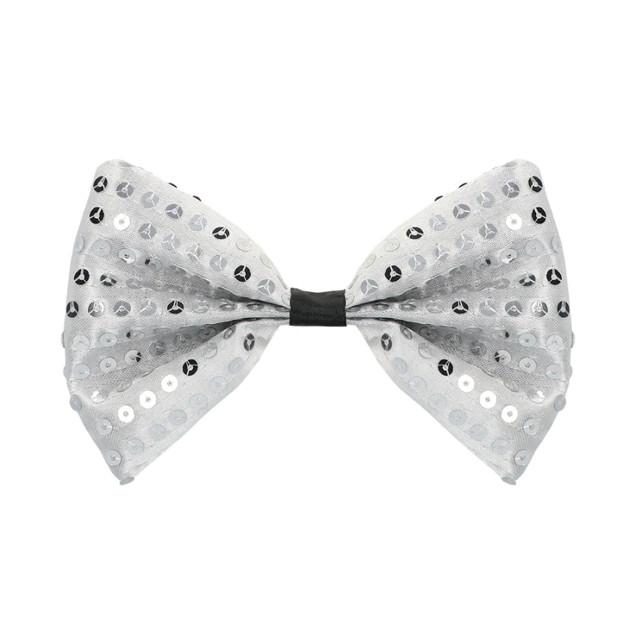 Cekinowy zestaw składający się z kamizelki i muchy w srebrnym kolorze stanowi uzupełnienie przebrania, jak również służy jako samodzielny imprezowy akcent stroju.