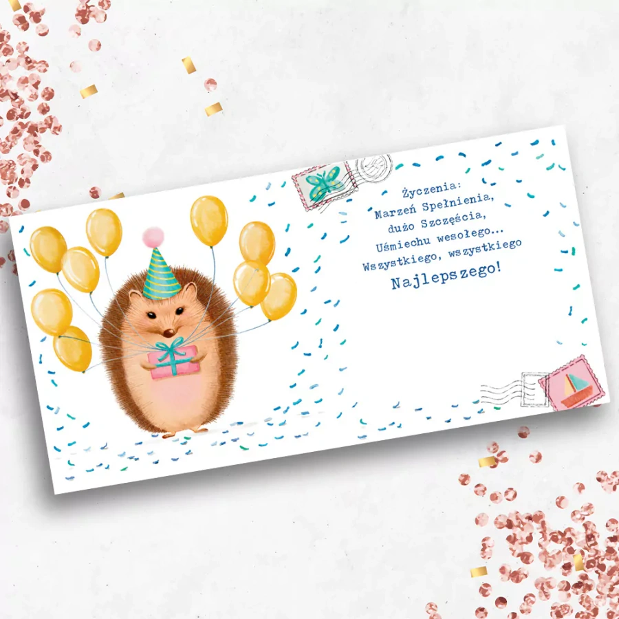Urocza kartka z życzeniami, idealna na urodziny i inne wyjątkowe okazje. Wesoły motyw jeżyka trzymającego prezent nadaje kartce ciepły, radosny charakter i z pewnością wywoła uśmiech na twarzy obdarowanej osoby. Napis „Najlepszego” sprawia, że kartka jest uniwersalna i pasuje zarówno dla dzieci, jak i dorosłych.