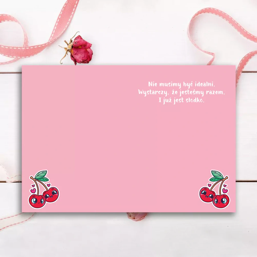 - w środku życzenia: "Nie musimy być idealni. Wystarczy, że jesteśmy razem. I już jest słodko."