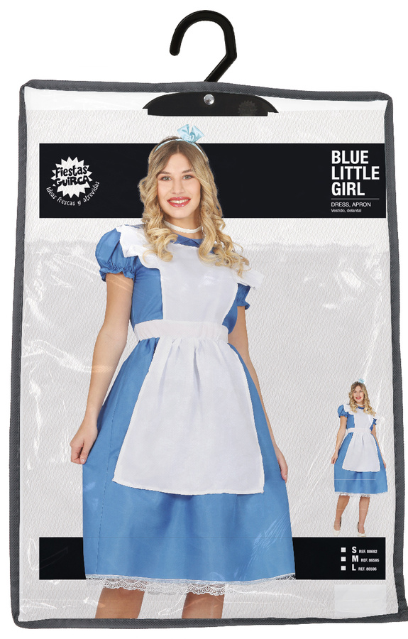Strój składa się z niebieskiej sukienki o prostym, dziewczęcym kroju z kontrastującym białym fartuchem, który nadaje całości charakterystycznego wyglądu. Dół sukienki wykończony ozdobną koronką. Lekka tkanina zapewnia komfort noszenia, a klasyczna kolorystyka sprawia, że strój jest od razu rozpoznawalny i ponadczasowy.