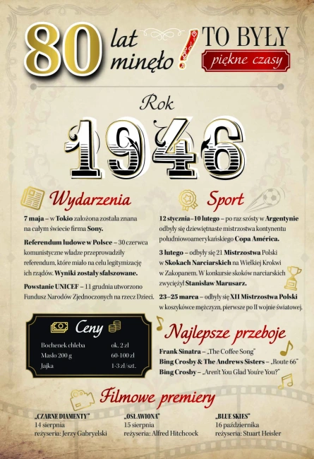 - Karta urodzinowa z okazji 80 urodzin, w formie kroniki zawierającej najważniejsze wydarzenia z 1946 roku.