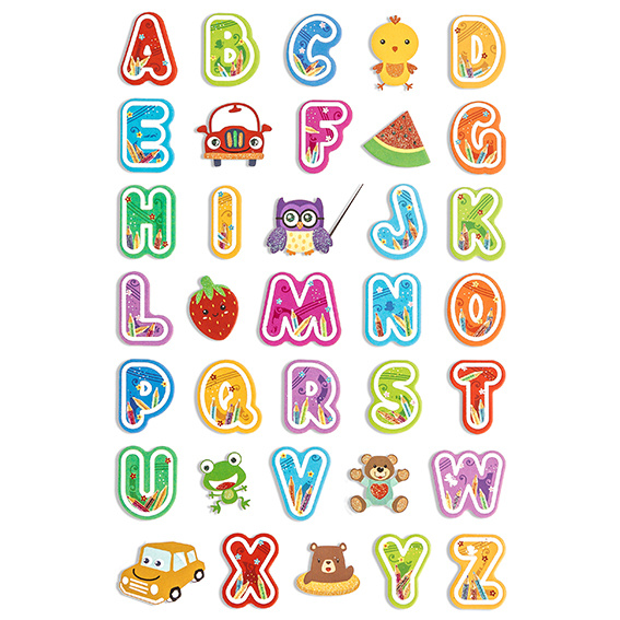 - Naklejki piankowe z brokatem. Alfabet uzupełniony o kika naklejek zwierztek i zabawek.