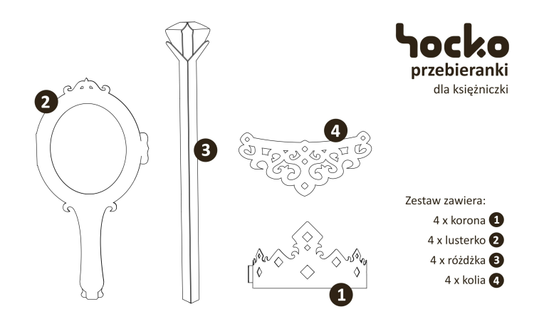 Opakowanie zawiera: 4 korony, 4 lusterka, 4 różdżki oraz 4 kolie.